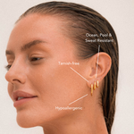 Our Triple Hoop Earrings Set includes three pairs of hoops in different sizes, making your hoop stacking dreams a reality. Wear them all the time, whether in the shower, at the gym, or in the ocean, and they will never lose color.