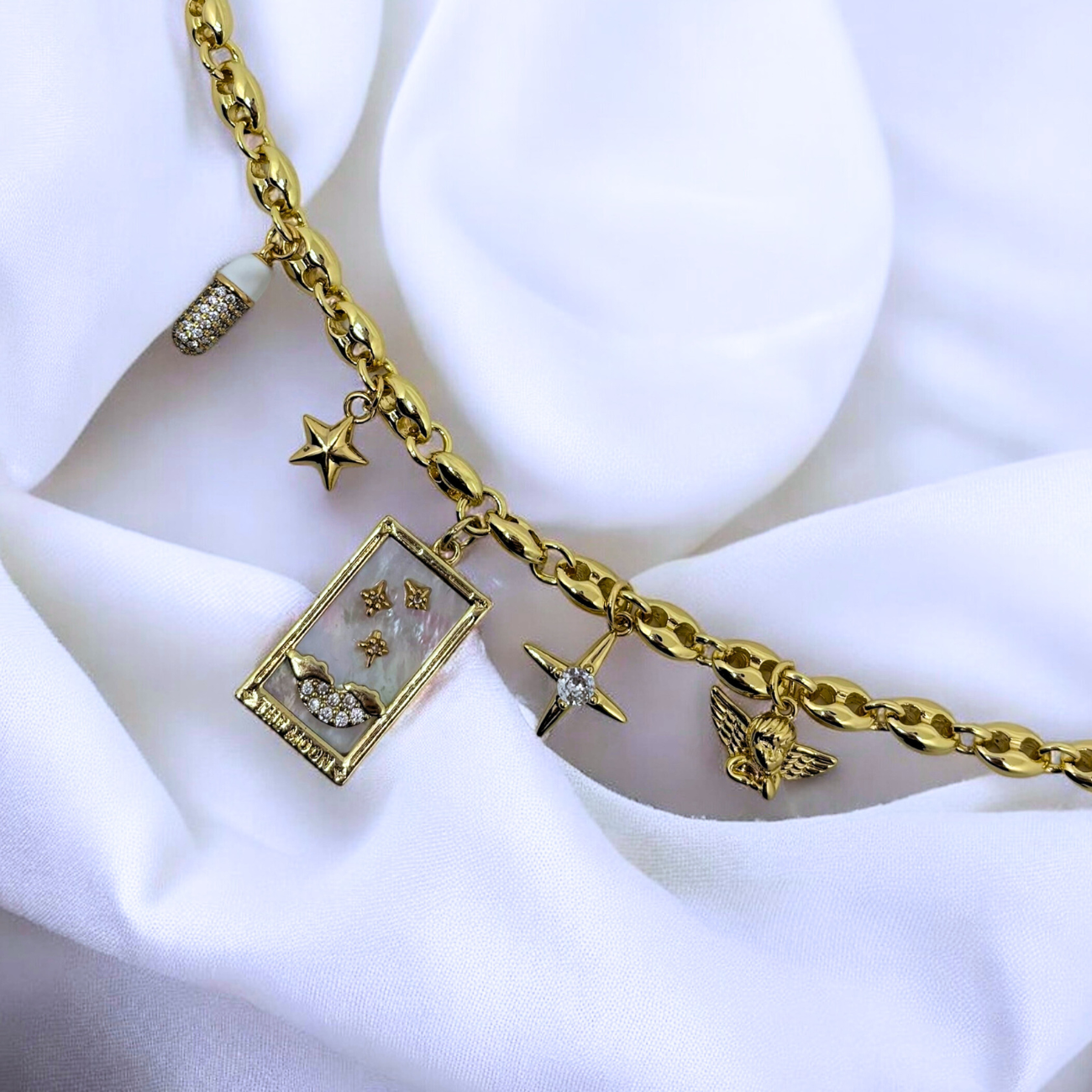 A celestial gold charm necklace featuring sparkling stars, angelic wings, and a dreamy glass pendant. A mesmerizing piece that embodies freedom, wonder, and the magic of the night sky.
