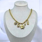 A delightful gold-plated chain necklace featuring charming details, including a jeweled heart, teddy bear, orchid flower, elegant drop pendant, and a luxurious capsule design, perfect for adding a touch of whimsy and sophistication to any outfit.