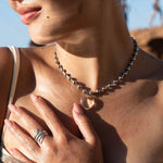 Clarity is a sophisticated necklace featuring a sleek, clear heart pendant elegantly suspended from a chain of lustrous silver beads. This piece combines simplicity with a touch of romance, ideal for versatile and elegant styling.