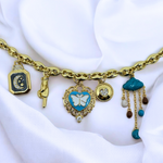 A beautiful chain necklace featuring delicate and dreamy charms, including a crescent moon medallion, hand motif, butterfly heart emblem, sparkling gem circle, and a whimsical dangling raincloud, embodying celestial elegance and serenity.