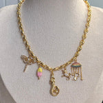 The Elira necklace is a dreamy and enchanting statement piece, perfect for adding a touch of whimsy to your style. Featuring a chunky gold chain adorned with magical charms—including a sparkling dragonfly, colorful ice cream, graceful mermaid, playful unicorn, and a rainbow charm with celestial details—this necklace is designed for those who love to embrace their imagination and playful side.