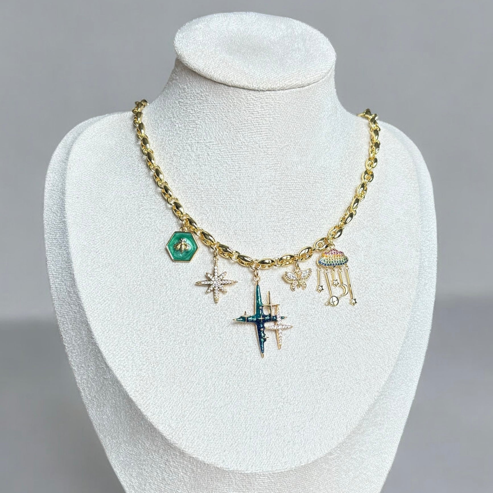 Introducing the handmade Felicity Necklace, an elegant gold chain featuring a blend of enchanting charms. Adorned with a green bee emblem, a sparkling star, and celestial motifs, this piece exudes a whimsical and luxurious charm, perfect for adding a touch of unique elegance to any ensemble.
