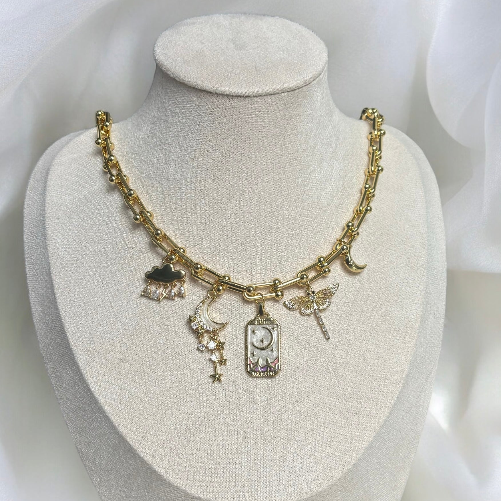 Luna Charm is a handmade gold necklace featuring an eclectic mix of whimsical charms, including a celestial moon, a delicate bee, and an array of colorful beads, perfect for adding a touch of magic to any outfit.