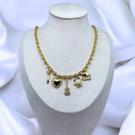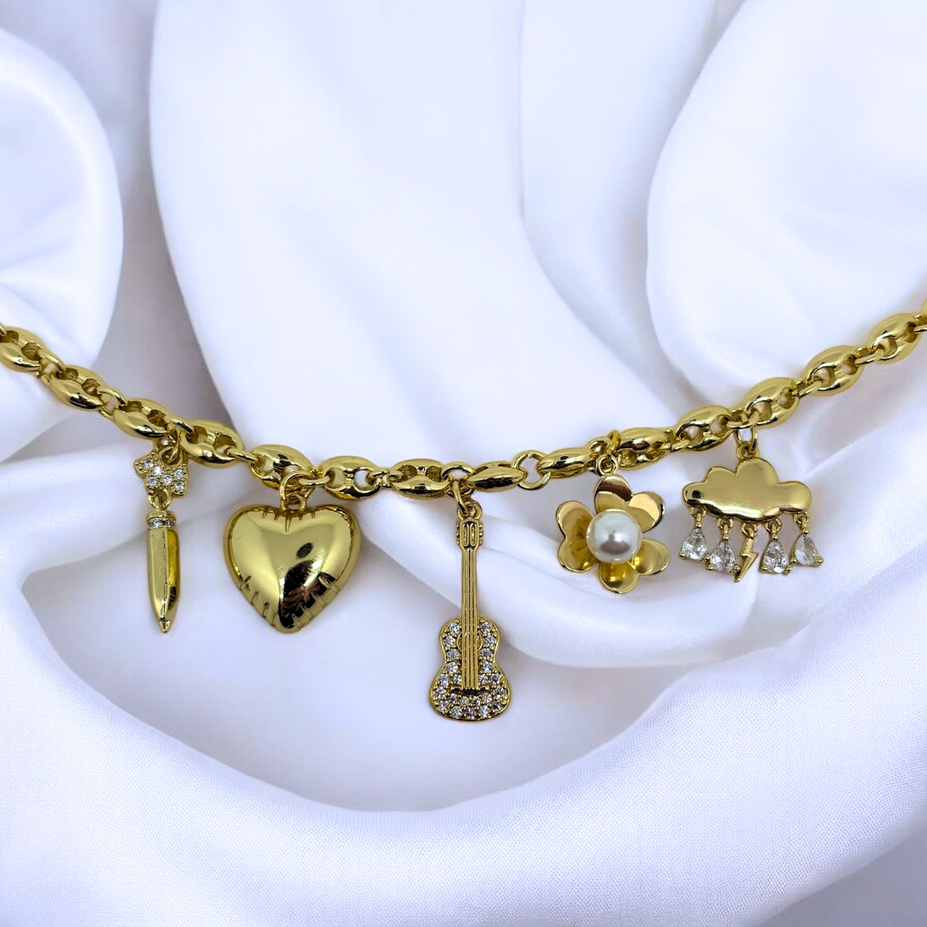 A charming gold-tone necklace featuring playful charms: a crystal pen, a stitched heart, a sparkling guitar, a pearl-accented flower, and a raincloud with crystal raindrops. A unique piece that blends romance, creativity, and nature.