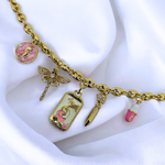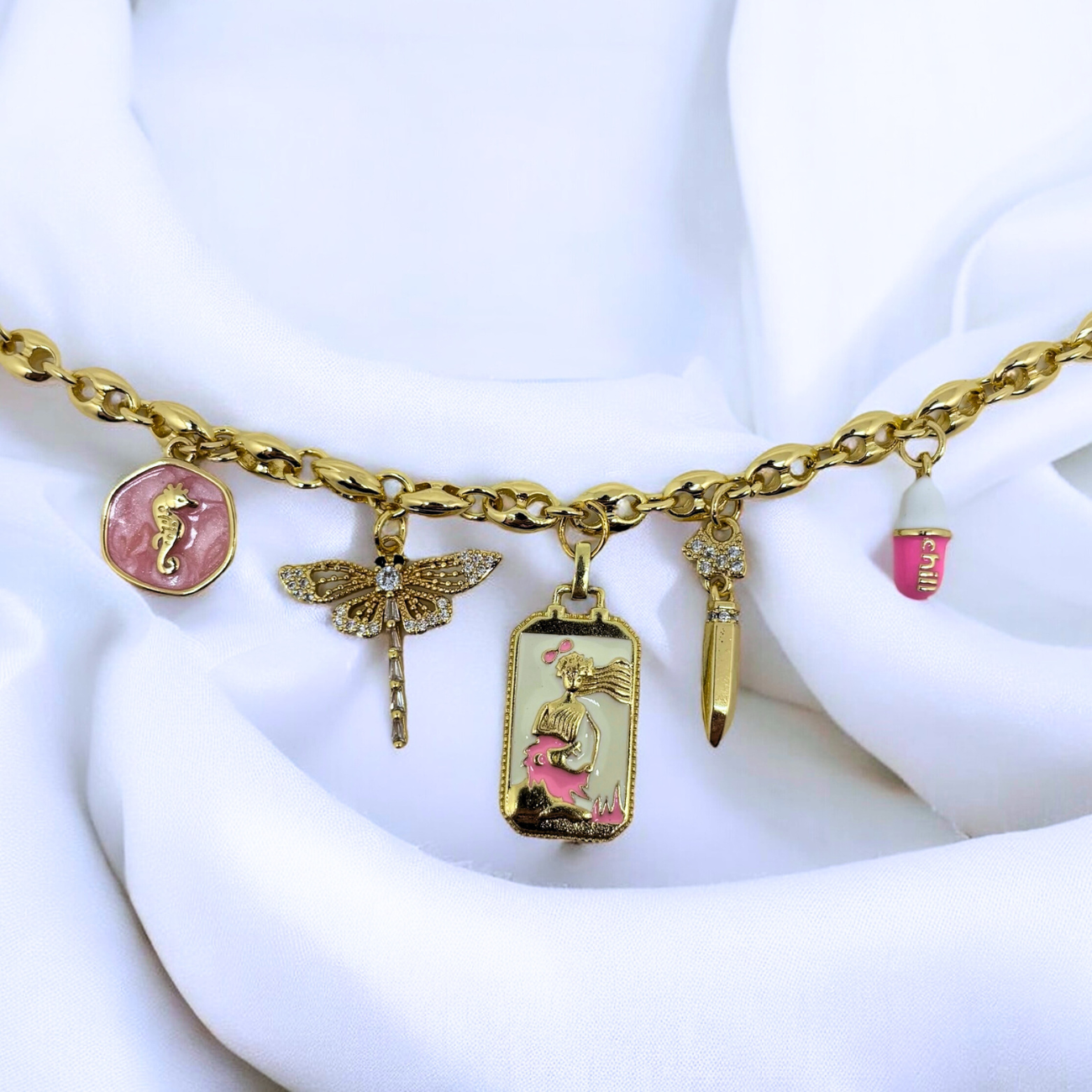 A playful gold-tone necklace featuring charming pink accents: a seahorse, dragonfly, mermaid tarot, crystal charm, and a cute “chill” cup. Perfect for adding a whimsical, ocean-inspired touch to your look.