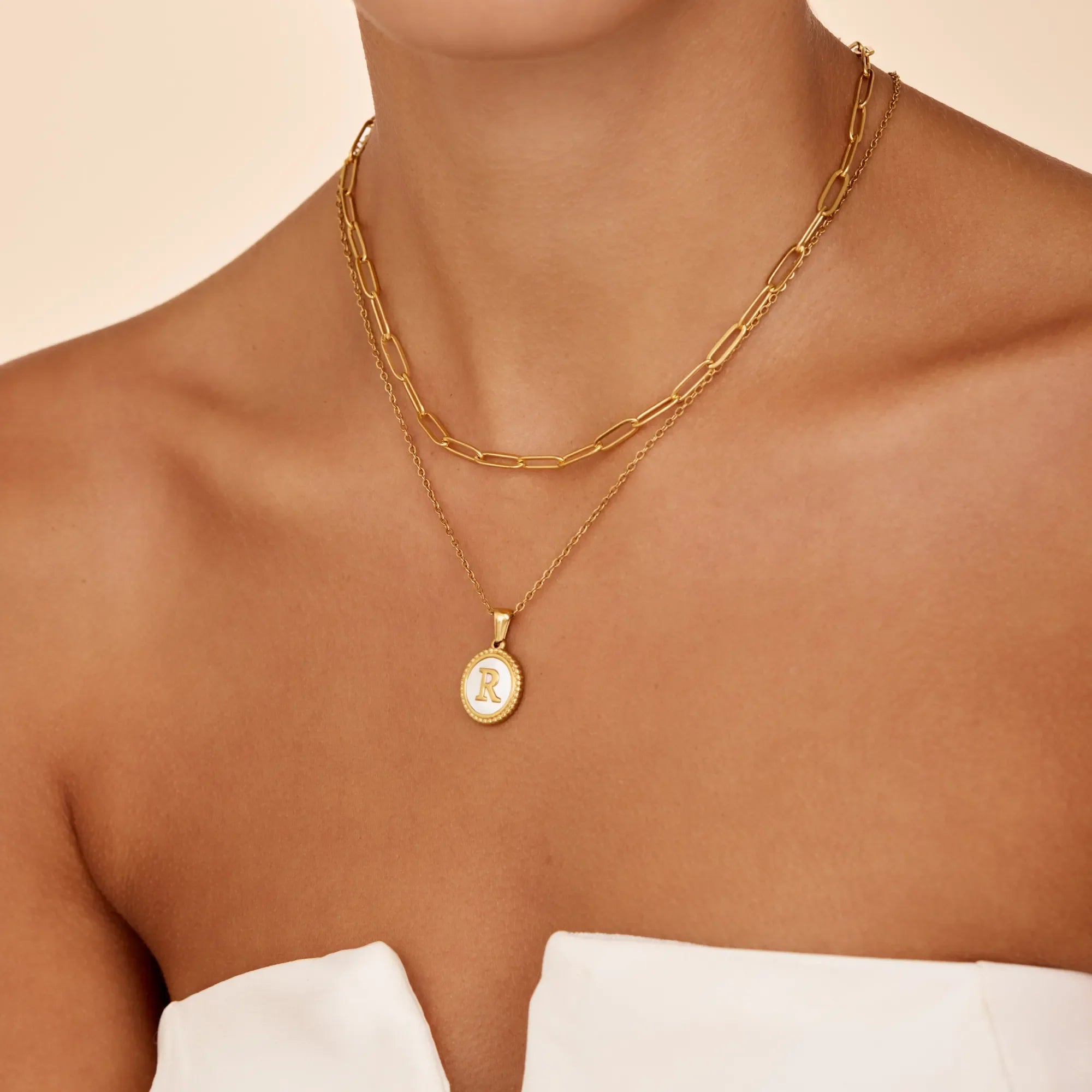 The Mother Of Pearl Initial Pendant Necklace features your chosen letter elegantly raised on a luminous round mother of pearl backdrop, framed in premium 18K gold plated stainless steel on a delicate chain. This waterproof, tarnish-resistant piece combines personal meaning with natural iridescence, creating a customized statement that maintains its luxurious shine while catching light beautifully through daily wear. Style this personalized pendant solo for a clean, elegant look or layer with other thin chains for added dimension.