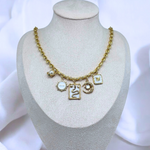 A gold-tone necklace featuring celestial and symbolic charms: a pearl planet, a sun, a serpent, a moon with stars, and a butterfly. A striking piece to add cosmic energy and mystery to your style.