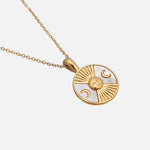 Radiant is a striking necklace showcasing a sun face encircled by graceful rays and crescent moons. This design embodies the harmonious balance of day and night, making it a powerful symbol of unity and elegance.