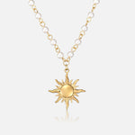 The Sol necklace radiates warmth and grace, with a golden sun pendant shining from a chain adorned with luminous pearls — a timeless celebration of light, life, and inner power.