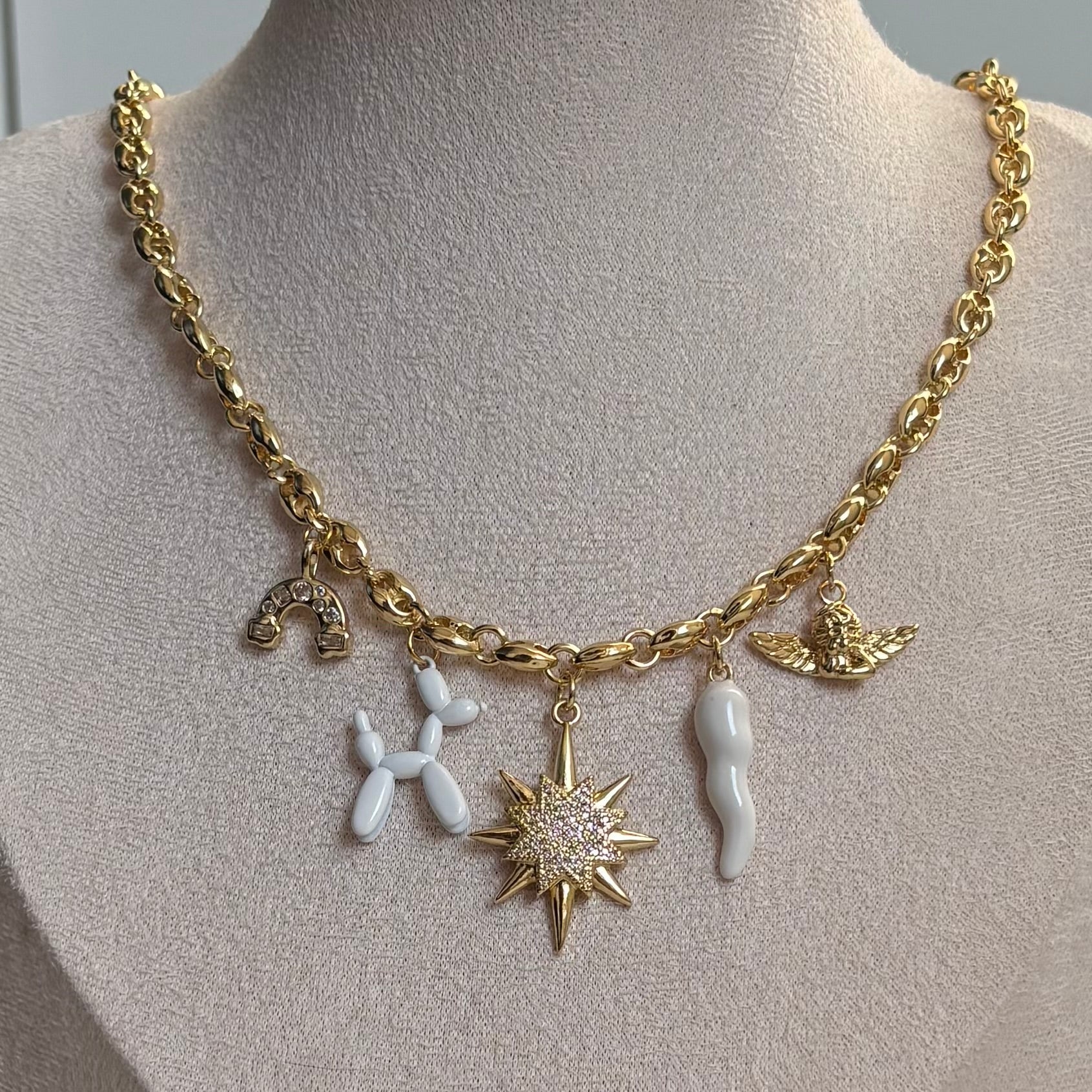 The Solere necklace is a radiant blend of elegance and whimsy, perfect for making a statement. Featuring a chunky gold chain adorned with charming details including a sparkling horseshoe, white balloon dog, dazzling sunburst, abstract charm, and a delicate angel this piece adds a playful yet sophisticated touch to any outfit.