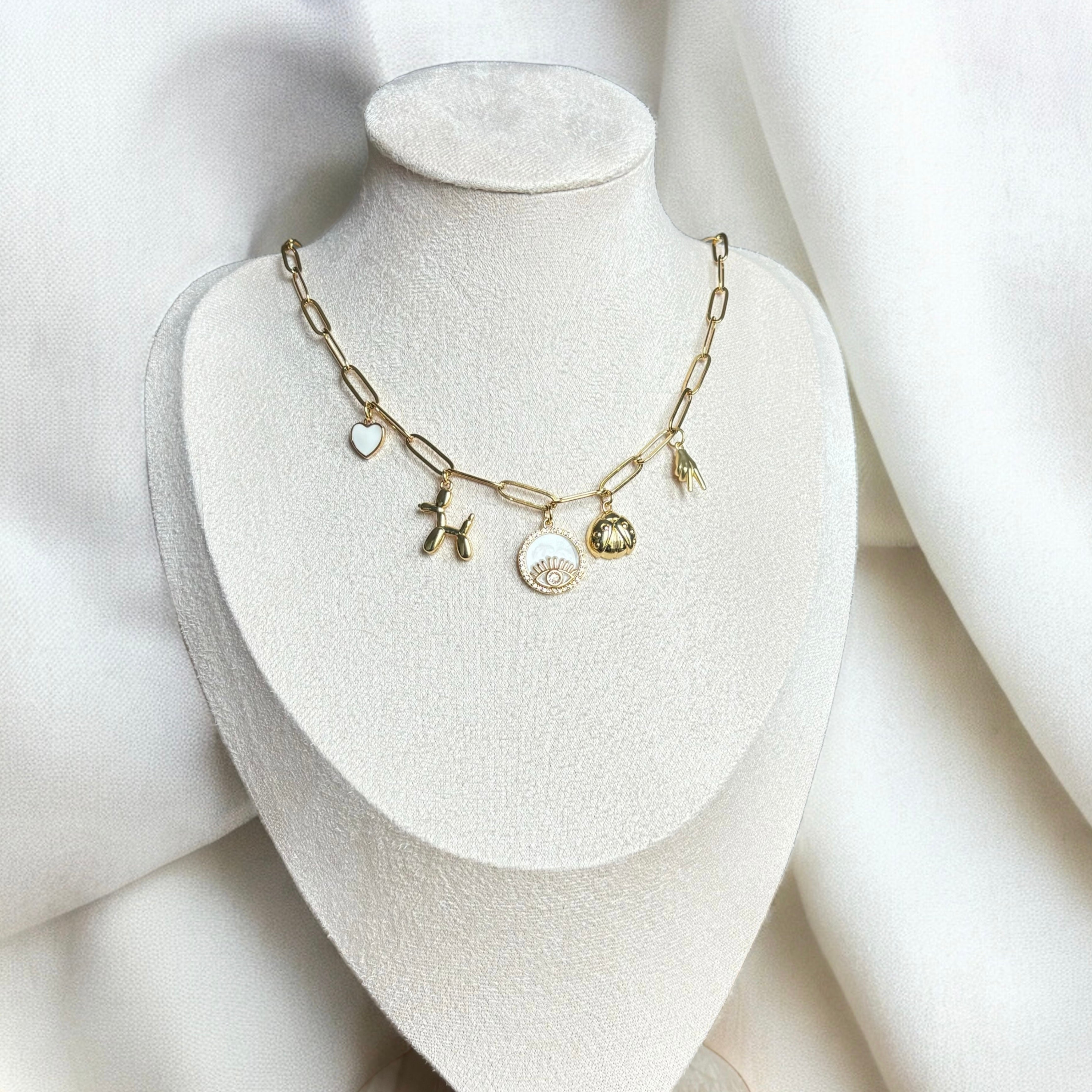 Bella Charm is a charming handmade gold necklace featuring a heart, a playful balloon dog, a mystical all-seeing eye, and a cute ladybug, making it a whimsical and enchanting addition to any jewelry collection.