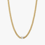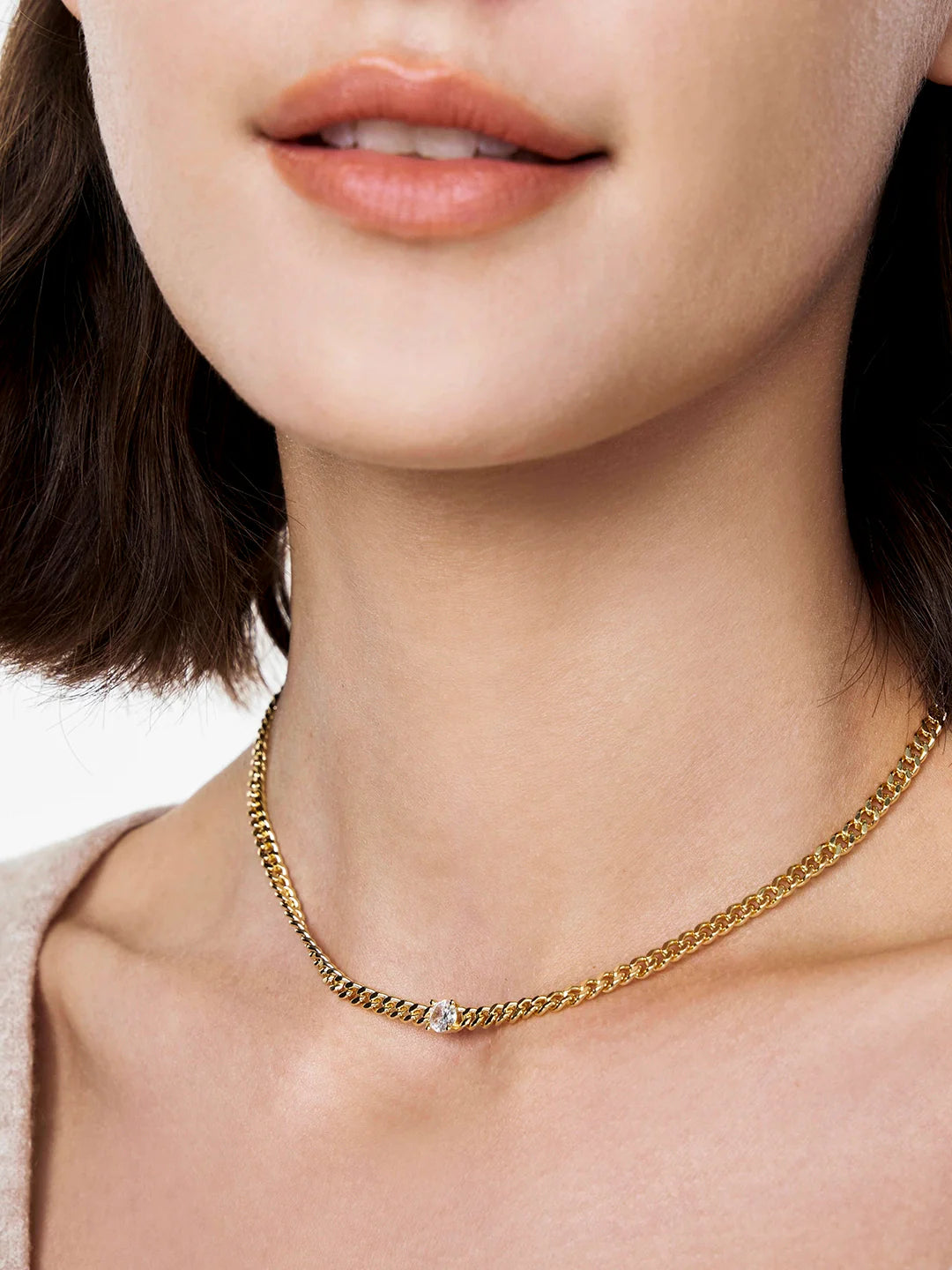 Elevate your everyday look with this bold necklace, adorned with a brilliantly-cut cubic zirconia. Its thick chain adds an extra touch of flair, ensuring you stand out in any crowd. This versatile piece is perfect for every occasion, from a day at the office to a morning workout session. Its shorter length allows for easy pairing with longer chains for a customizable layered look. A must-have essential for every jewelry collection, this necklace is sure to become your go-to accessory.
