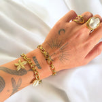 A charming bracelet featuring ocean-inspired charms, including a starfish, seashell, and cowrie shell, all delicately hanging from a gold chain. This piece captures a playful, beachy vibe, perfect for adding a touch of seaside elegance to any look.