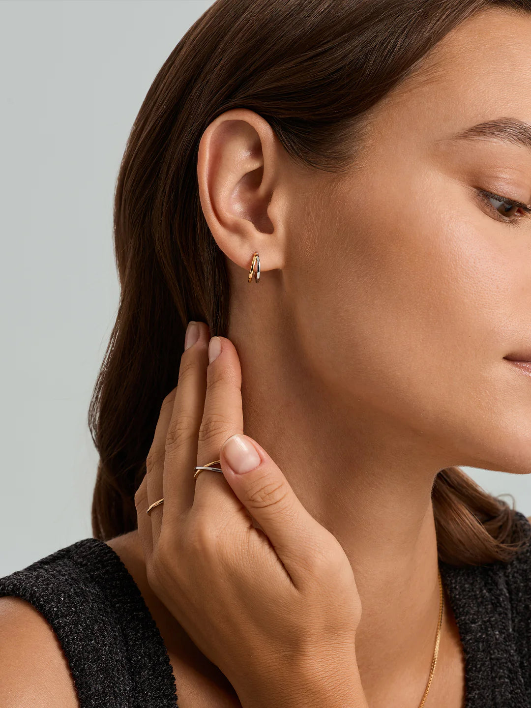 Elevate your ear stack with the Mixed Minimalist Double Semicircle Huggies. Featuring a chic v-split design and a mix of gold and silver, these sleek hoops effortlessly transition from day to night. Style them alone for a refined vibe or stack them for more impact.
