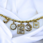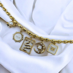 A gold-tone necklace featuring celestial and symbolic charms: a pearl planet, a sun, a serpent, a moon with stars, and a butterfly. A striking piece to add cosmic energy and mystery to your style.