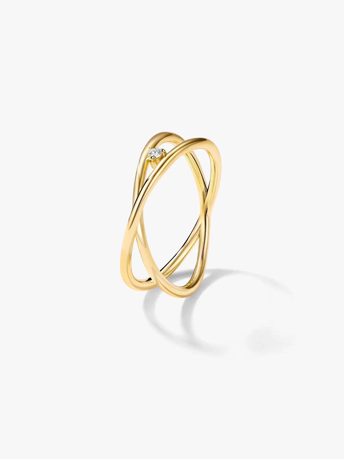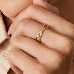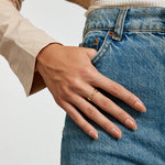 Featuring a sleek overlapping band and a stunning white crystal, the gold vermeil band ring is your new go-to statement stacker. With its bold silhouette and captivating sparkle, this ring is sure to catch compliments wherever you go.