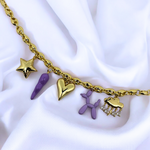 A bold gold-tone necklace featuring fun and whimsical charms: a puffy star, a purple chili pepper, a heart, a balloon dog, and a raincloud with crystal raindrops. Perfect for adding a playful twist to any outfit!