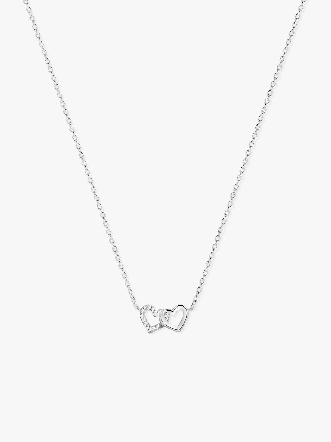 Experience the magic of love with our Interlocking Double Heart Necklace—a petite treasure from the heart of elegance. Handcrafted from rhodium plated over sterling silver, this delicate necklace features two interlocking hearts adorned with sparkling crystals. Its timeless design symbolizes unity, commitment, and the exquisite beauty of connection.