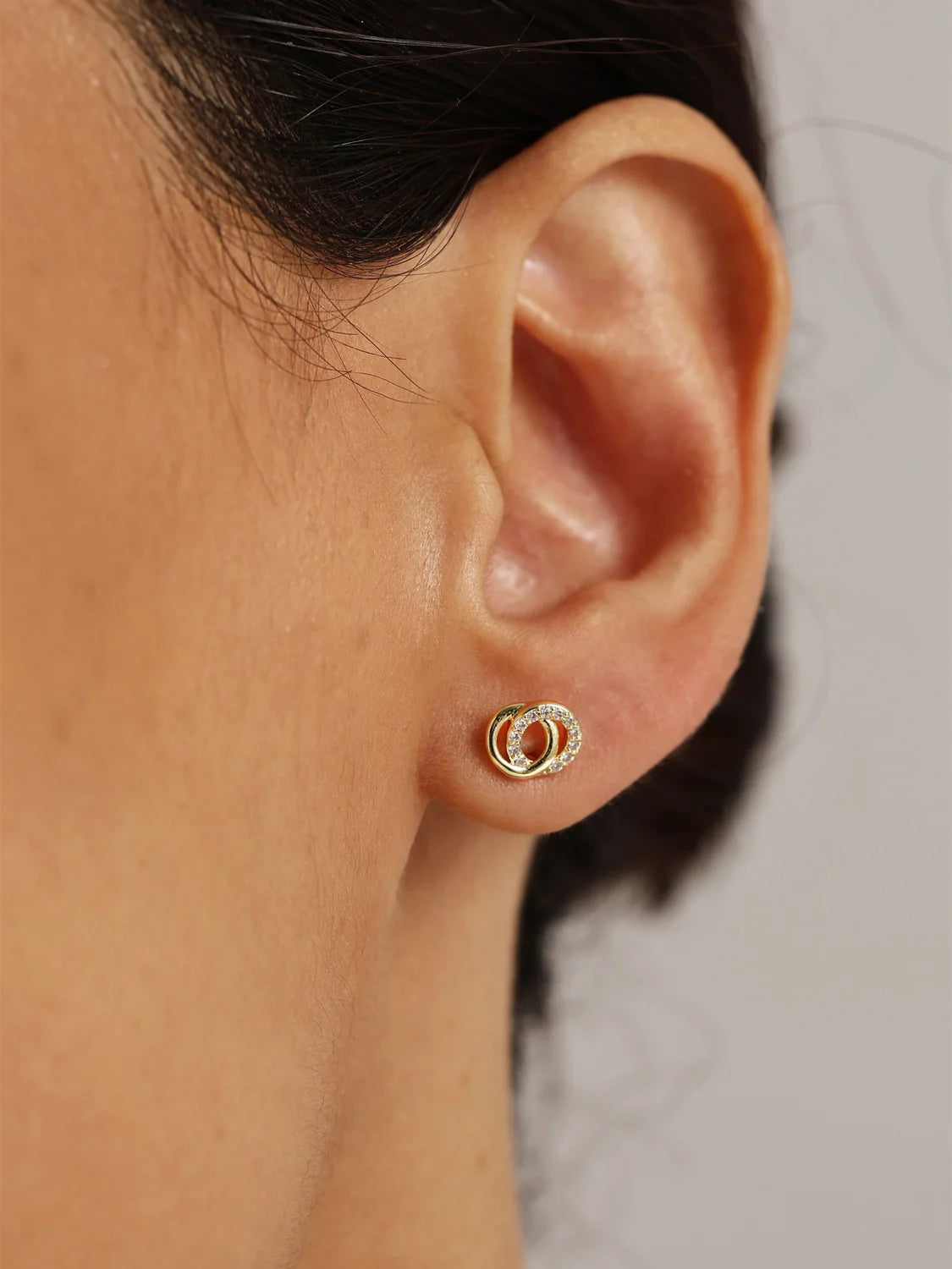 These Double Circle Half Pave Stud Earrings make a great present for either yourself or someone special, as they represent the concepts of love and unity through their interlocking circles. They are small, shiny, and timeless, adding a touch of elegance to any outfit you wear them with.
