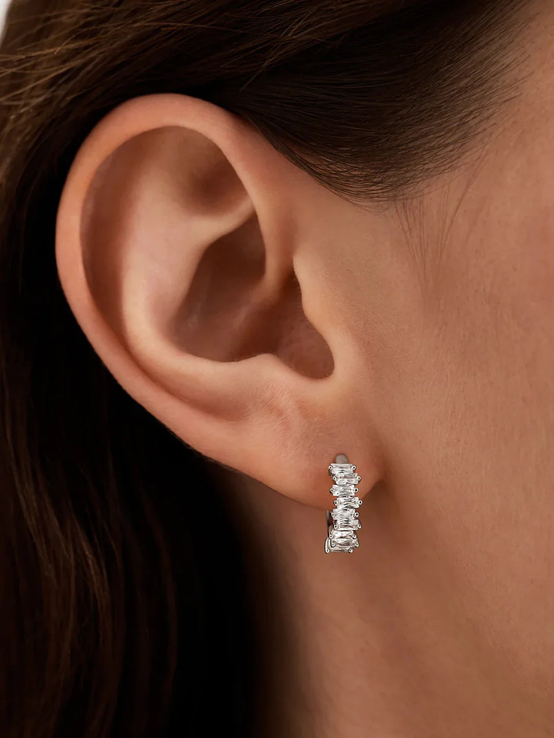 Step into a world of refined glamour with our Horizontal Set Mini Baguette Sapphire Huggie Earrings—a celebration of bold sophistication! Crafted to perfection, these earrings showcase a stunning arrangement of white sapphire baguettes in a chic zig-zag pattern. Their signature glimmer adds an enchanting touch of elegance, making them the ideal accessory for any special event. For a curated and coordinated style, pair them flawlessly with our Vertical Crystal Baguette Delicate Ring.