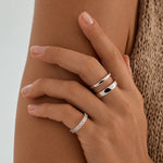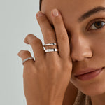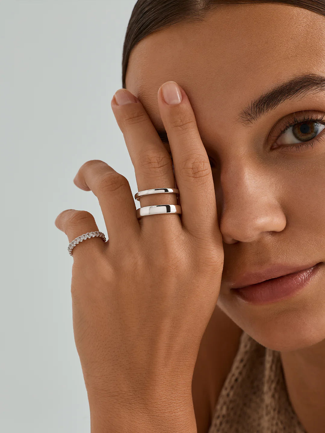 This ring features a striking dual-layer design that makes stacking effortlessly stylish. The mixed metals in varying widths create a beautiful interplay of textures, combining modern elegance with timeless versatility.